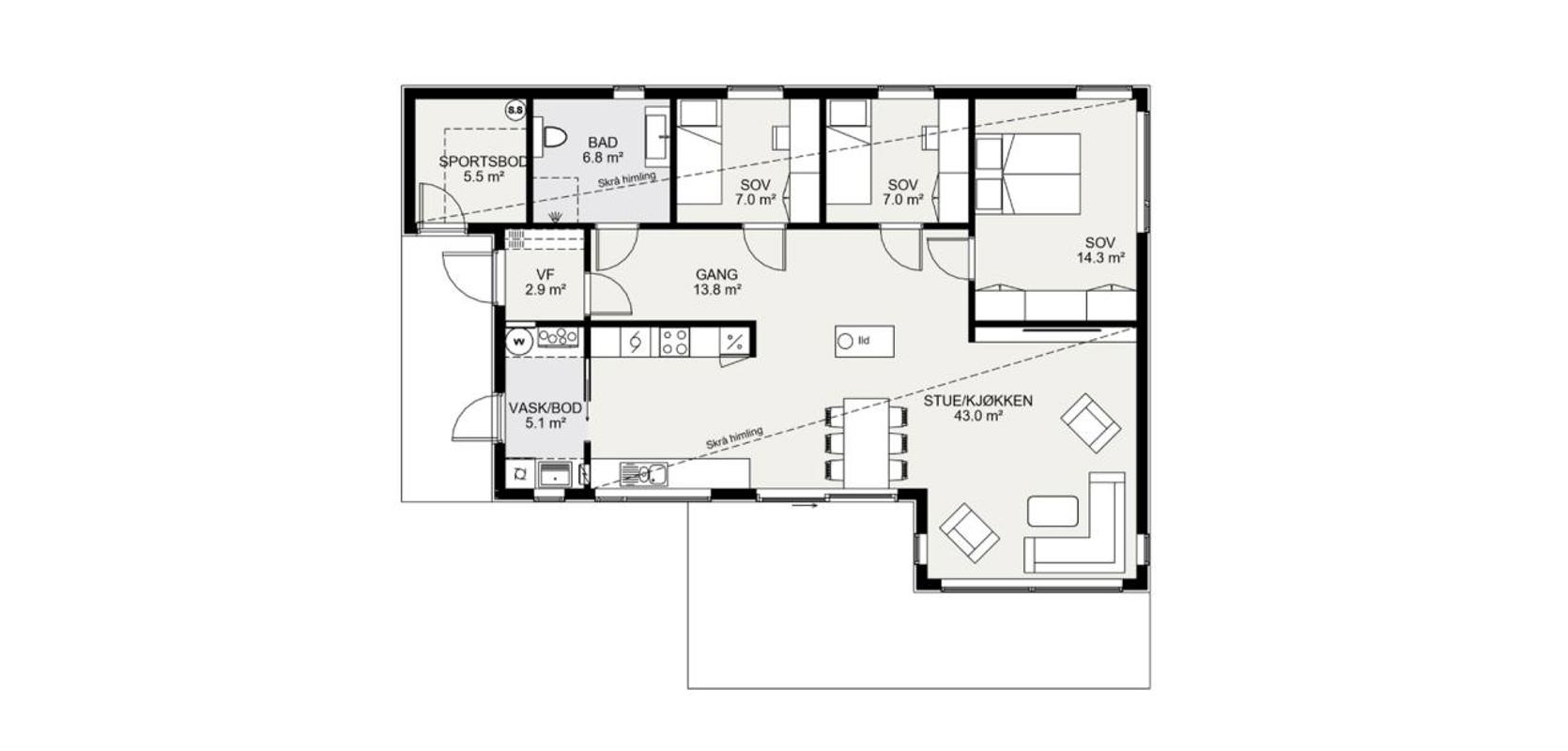 En annen fordel med Lindås er pulttaket som gir ekstra takhøyde i stuen og oppholdsrommet. Dette skaper en luftig og romslig atmosfære, samtidig som det slipper inn rikelig med naturlig lys gjennom de mange vindusflatene. Den åpne planløsningen mot kjøkkenet gir en følelse av sammenheng, samtidig som kjøkkenet er delvis avskjermet. Fra kjøkkenet har du også tilgang til vaskerommet.