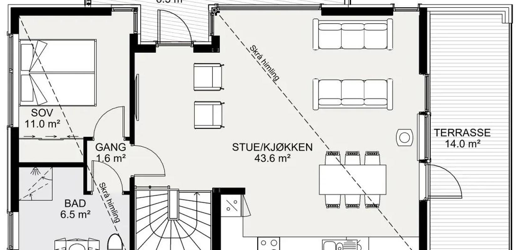På hovedplanet, som nås via en trapp fra underetasjen, finner du en åpen stue- og kjøkkenløsning. Et stort oppholdsrom skaper en luftig atmosfære, og kjøkkenet har god plass og moderne innredning. På dette planet er det også et romslig soverom med eget bad. Fra stueområdet har du utgang til en sjarmerende, skråstilt balkong som gir et flott utsyn fra husets front. En overbygd balkong på husets kortside er tilgjengelig fra stue- og kjøkkenområdet og inviterer til utendørsaktiviteter.